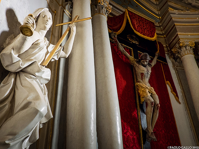 Apse-altar. Infantino Farina, Cross, cartapesta (XVII century). On the sides the Fath and the Hope (left) statue of plaster made by Gioacchino Gianforma from Catania (1783-1784).